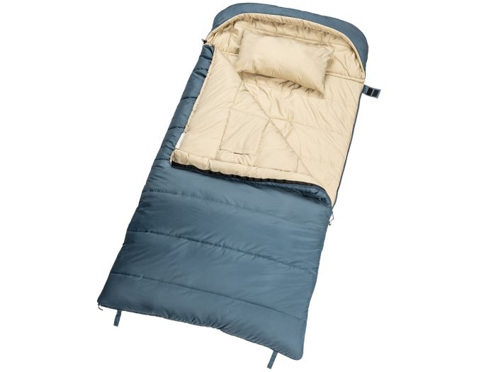 Het royale hoofdgedeelte heeft een 13 cm hoge rand met trekkoord, zodat je je helemaal kunt inbedden en je hoofd en schouders lekker warm blijven. Indien nodig kan het dankzij de rits volledig van de slaapzak worden losgemaakt, zodat de slaapzak met de hoofdrits volledig open kan worden uitgespreid tot een groot, rechthoekig deken.