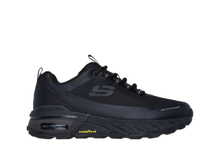 Wandel in duurzaam comfort in Skechers Max Protect - Fast Track heren schoenen - Black Deze veterschoen heeft een waterafstotende bovenkant van leer en mesh met een Skechers Memory Foam binnenzool.