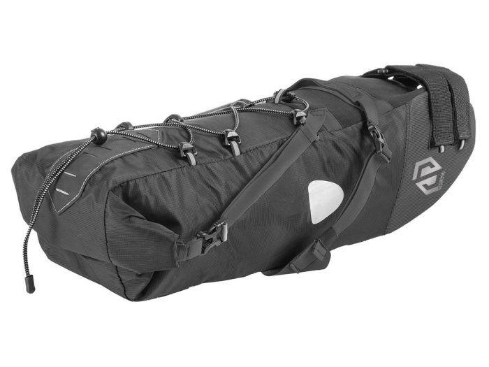 Zadeltas van 210D nylon polyester 420D TPU scheurvast en waterdicht materiaal met gelaste naden aan de binnenkant om de inhoud geïsoleerd te houden van de buitenomgeving. Klittenband voor bevestiging aan de zadelpen en plastic clip voor bevestiging aan het zadel. Reflecterende delen voor meer veiligheid. - Afmetingen 60 x 13 x 15cm - inhoud 11 liter