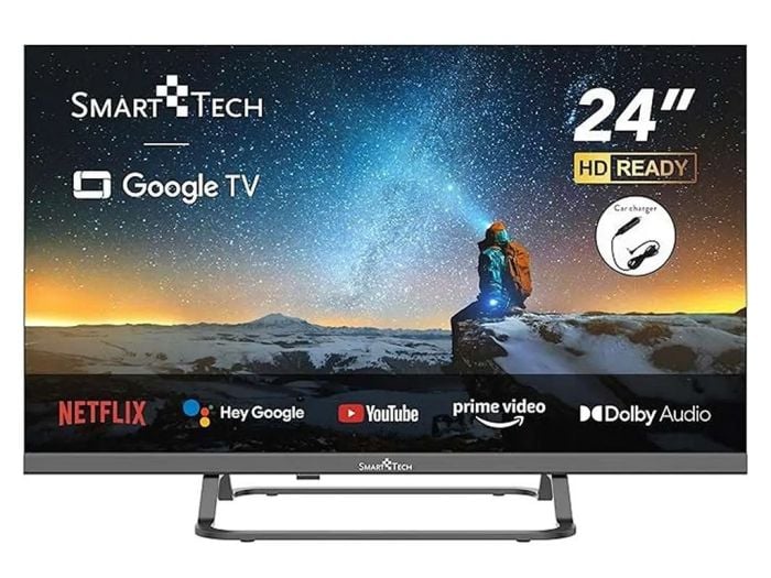 De Smart Tech 24HG01VC is een veelzijdige 24-inch (60 cm) HD LED Google TV™, ideaal voor zowel thuisgebruik als onderweg. Dankzij het compacte formaat en de meegeleverde 12V autolader is deze tv perfect voor gebruik in campers, boten of vrachtwagens.