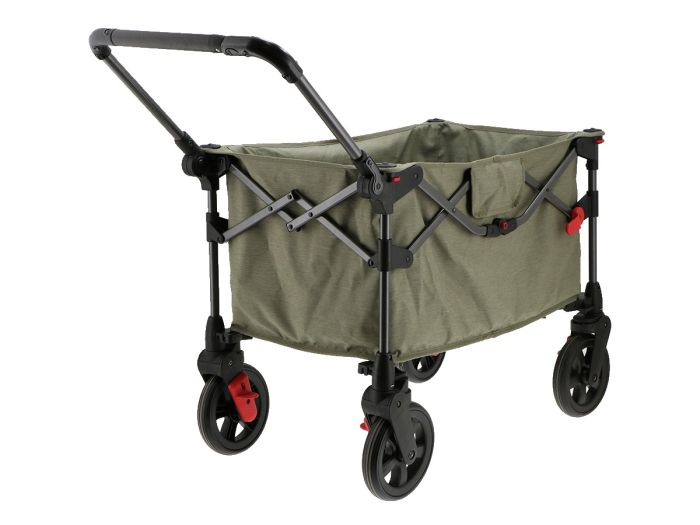 De Porto bolderkar in de kleur mosgroen is jouw helpende hand bij het vervoeren van jouw kampeerstoelen, een koelbox of andere kampeerspullen naar je kampeerplek. Dat scheelt een hoop heen en weer sjouwen. Ook voor een dagje strand of op een festivalcamping is de kar ideaal. De twee zwenkwielen aan de voorkant zijn uiterst wendbaar en maken het makkelijk om soepel over elk terrein te rijden, van grindpaadjes tot festivalvelden. Met de positioneerbare duwhandgreep duw je de kar zonder moeite vooruit. De handgreep is bovendien in meerdere standen verstelbaar, zodat je altijd comfortabel loopt. De vaste achterwielen met remmen zorgen voor stabiliteit en houden de kar stevig op zijn plek wanneer je stilstaat.