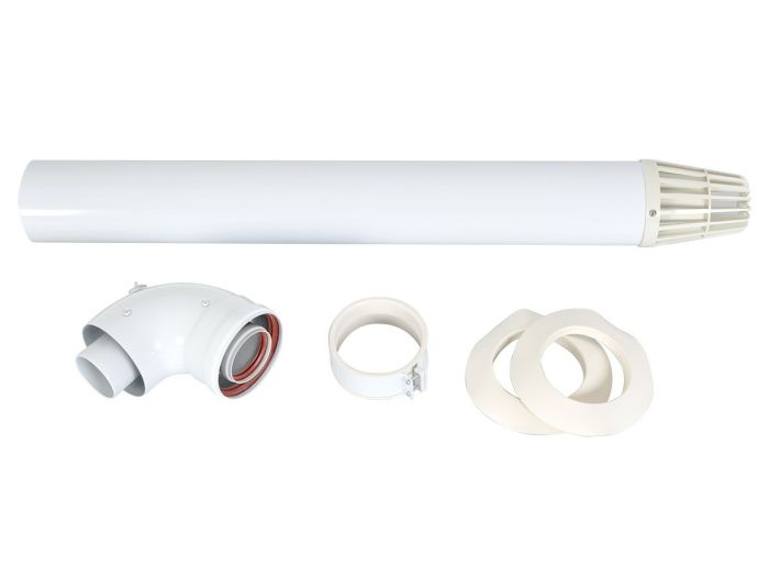 Deze horizontale concentrische afvoerset is CE gecertificeerd en wordt geleverd met een 90 graden bocht, 70 cm afvoerpijp met eindkap en rubber manchetten. De afvoerpijp is voorzien van een binnenpijp, beide zijn gemaakt van aluminium.