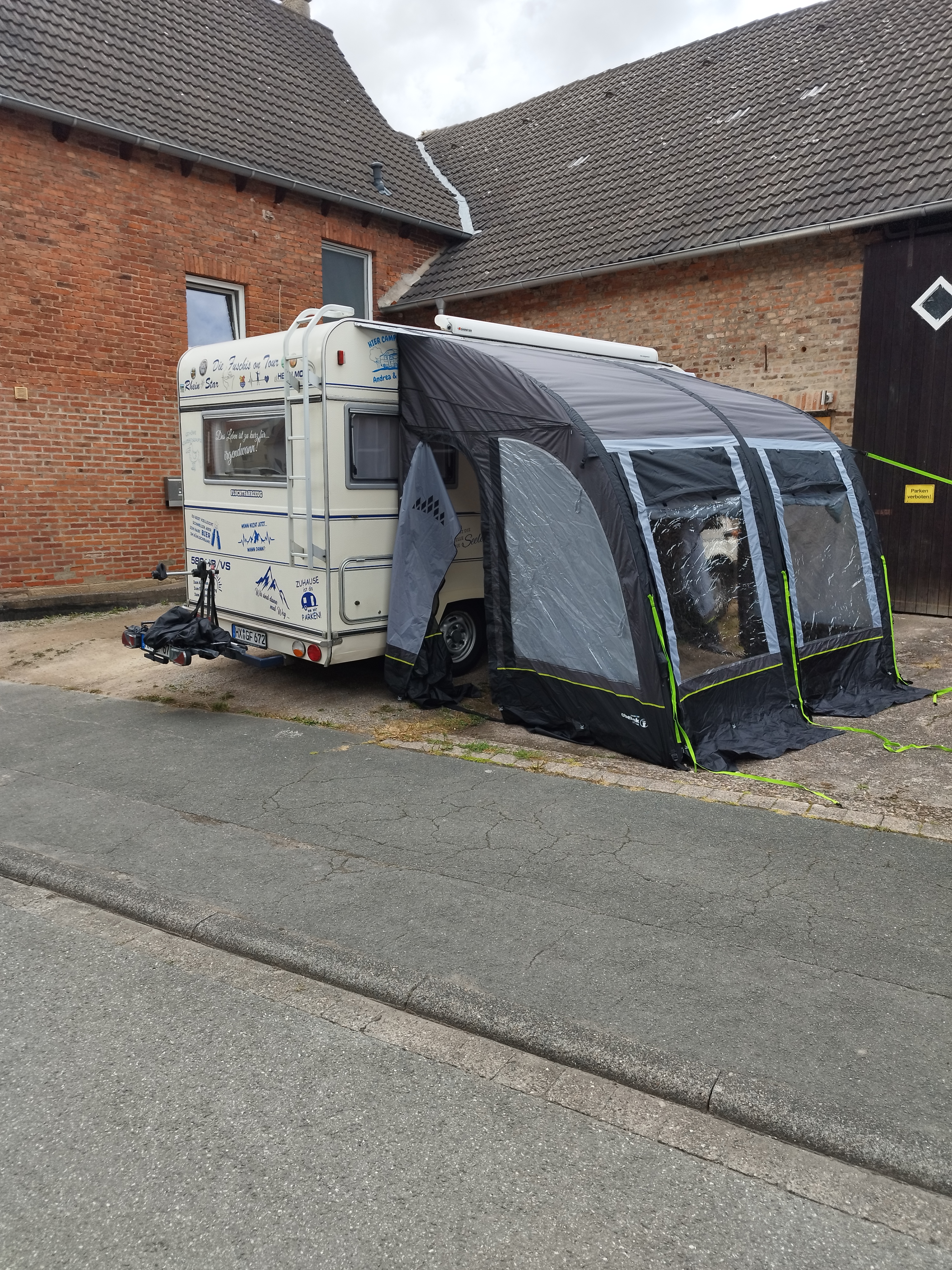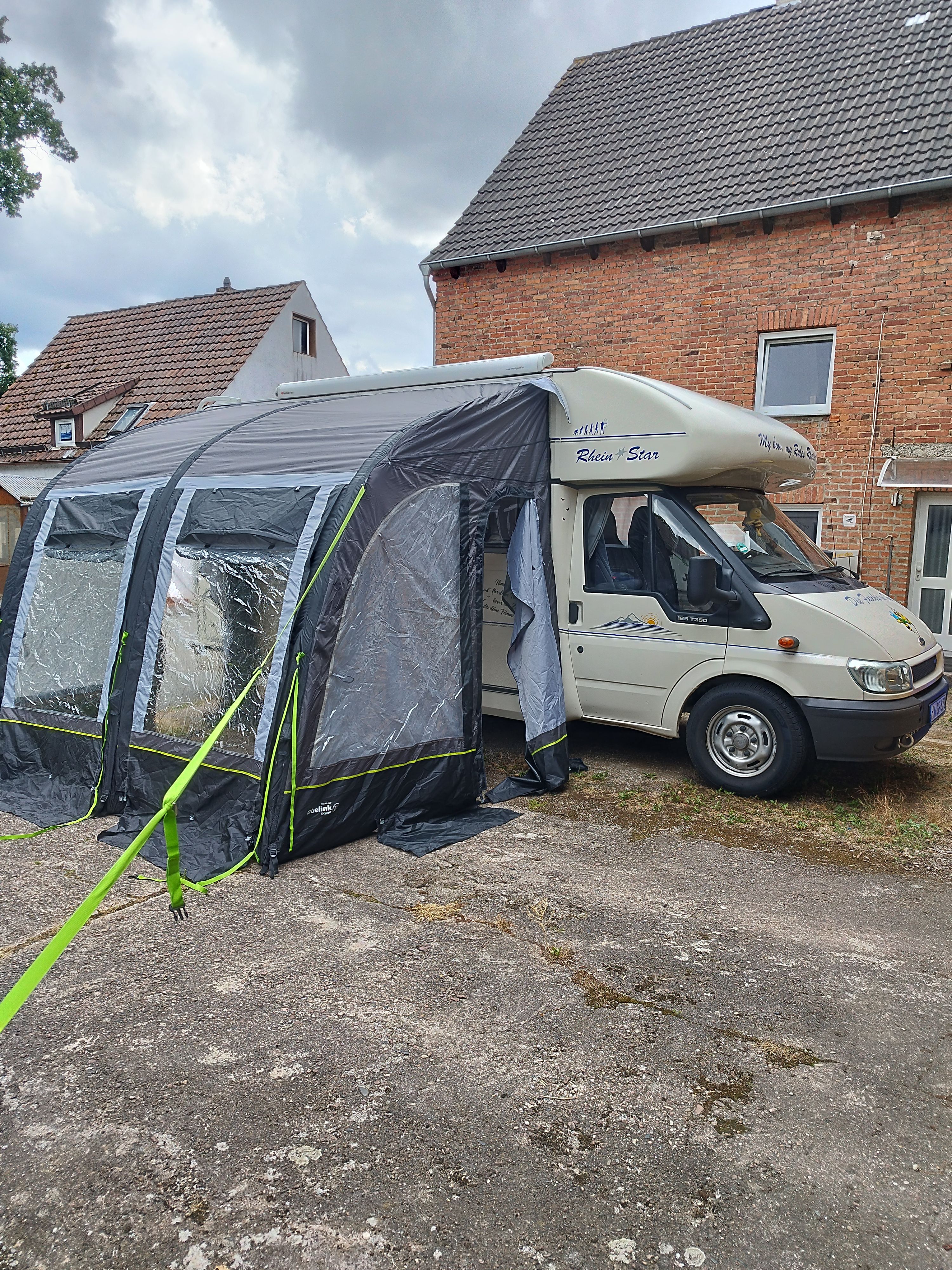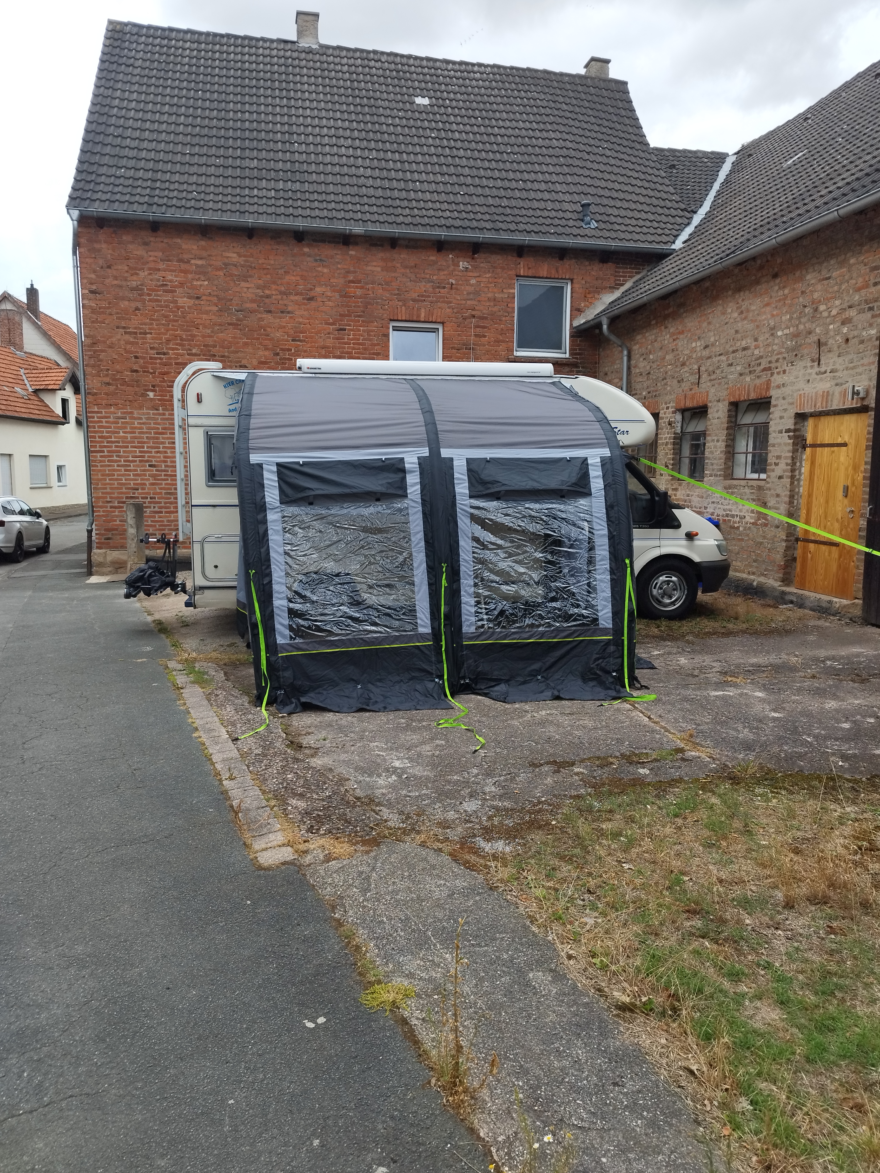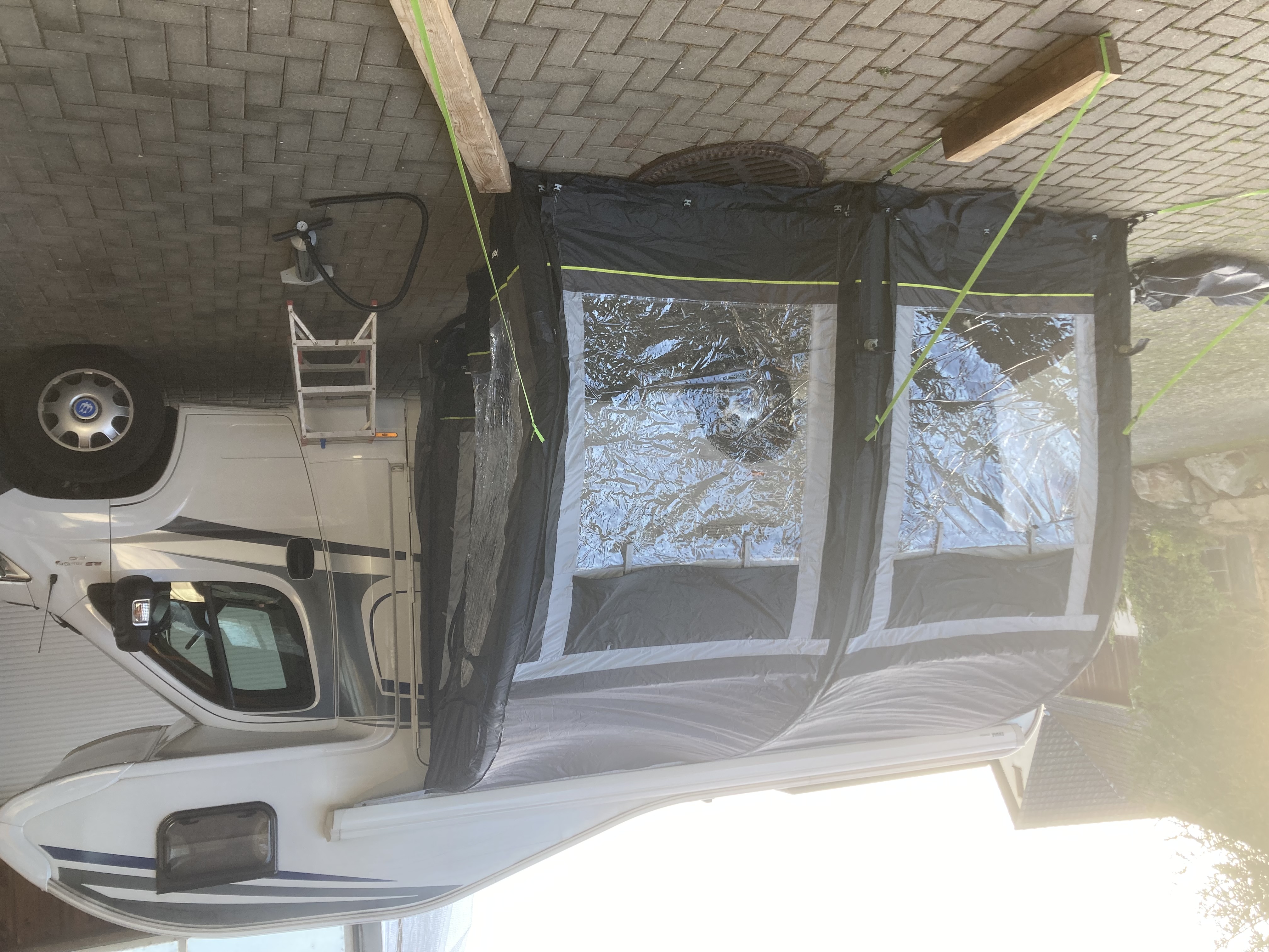 Deze tent, voortent of luifel is voorzien van opblaasbare luchtslangen i.p.v. tentstokken.
