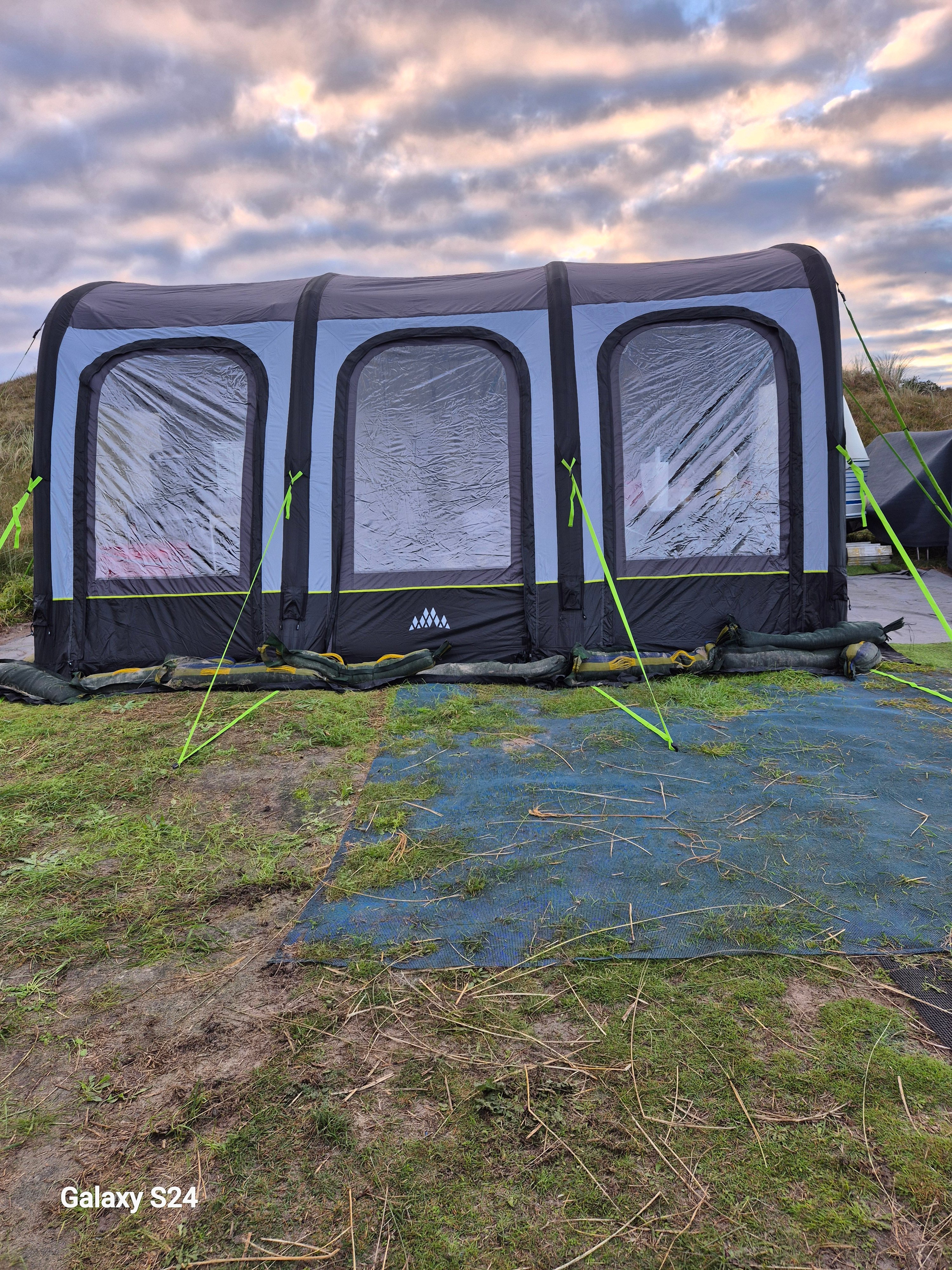 Deze tent, voortent of luifel is voorzien van opblaasbare luchtslangen i.p.v. tentstokken.