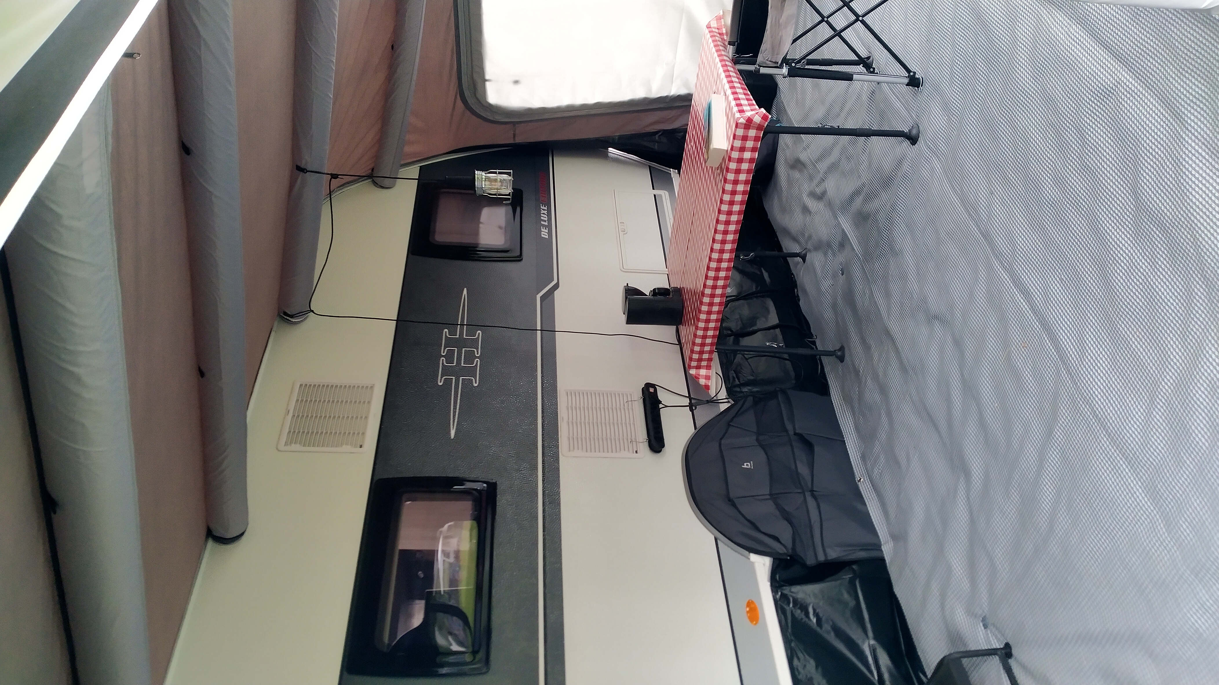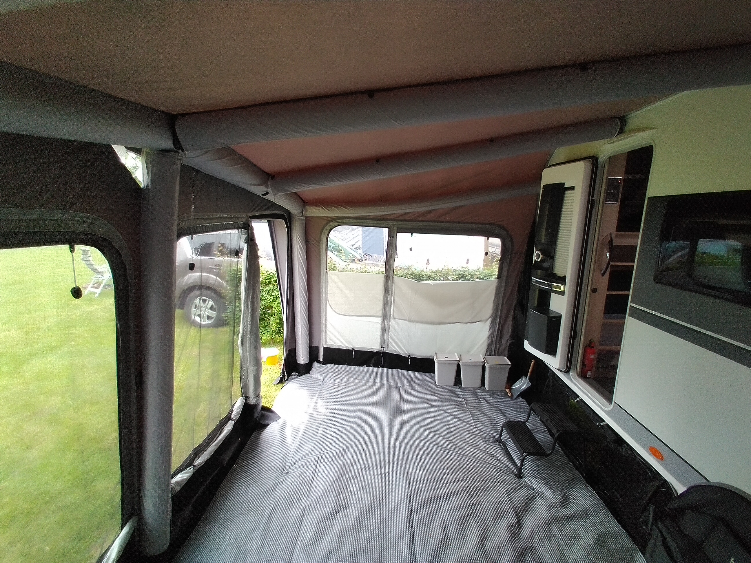 Deze tent, voortent of luifel is voorzien van opblaasbare luchtslangen i.p.v. tentstokken.