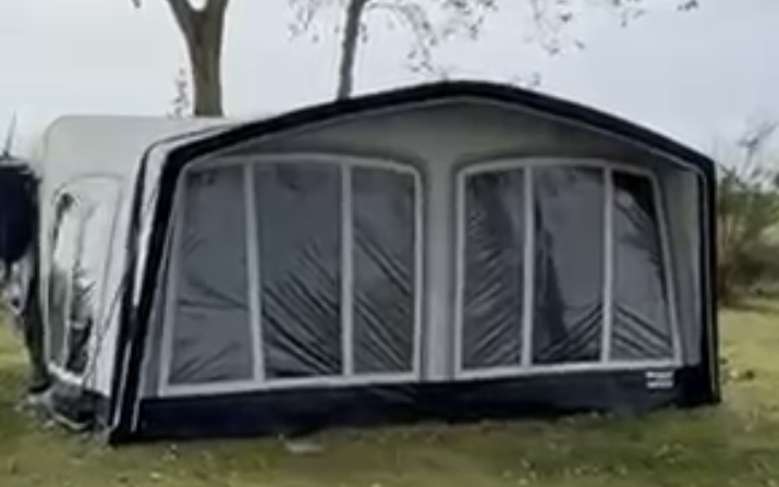 Deze tent, voortent of luifel is voorzien van opblaasbare luchtslangen i.p.v. tentstokken.