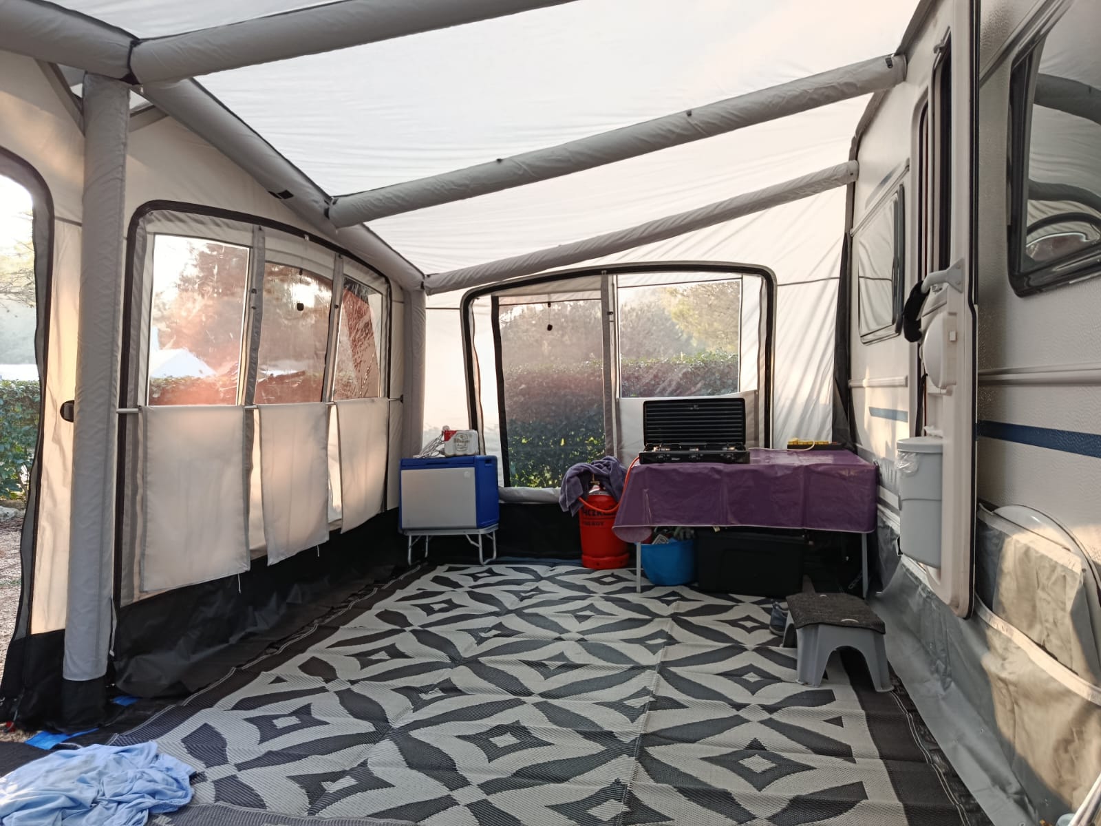 Deze tent, voortent of luifel is voorzien van opblaasbare luchtslangen i.p.v. tentstokken.