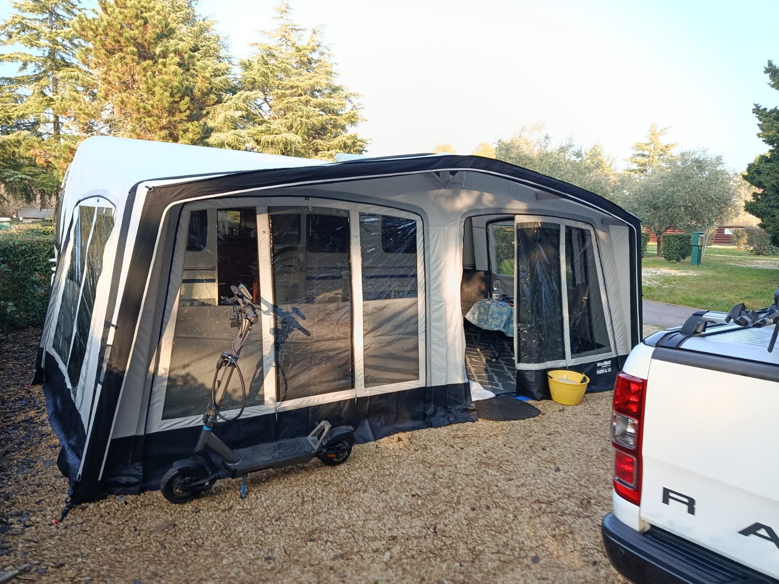 De Westfield Pluto XL 2.0 in maat 9 is een extra diepe opblaasbare voortent voor caravans met een omloopmaat van 981 tot 1015 cm die de gehele caravan bedekt.